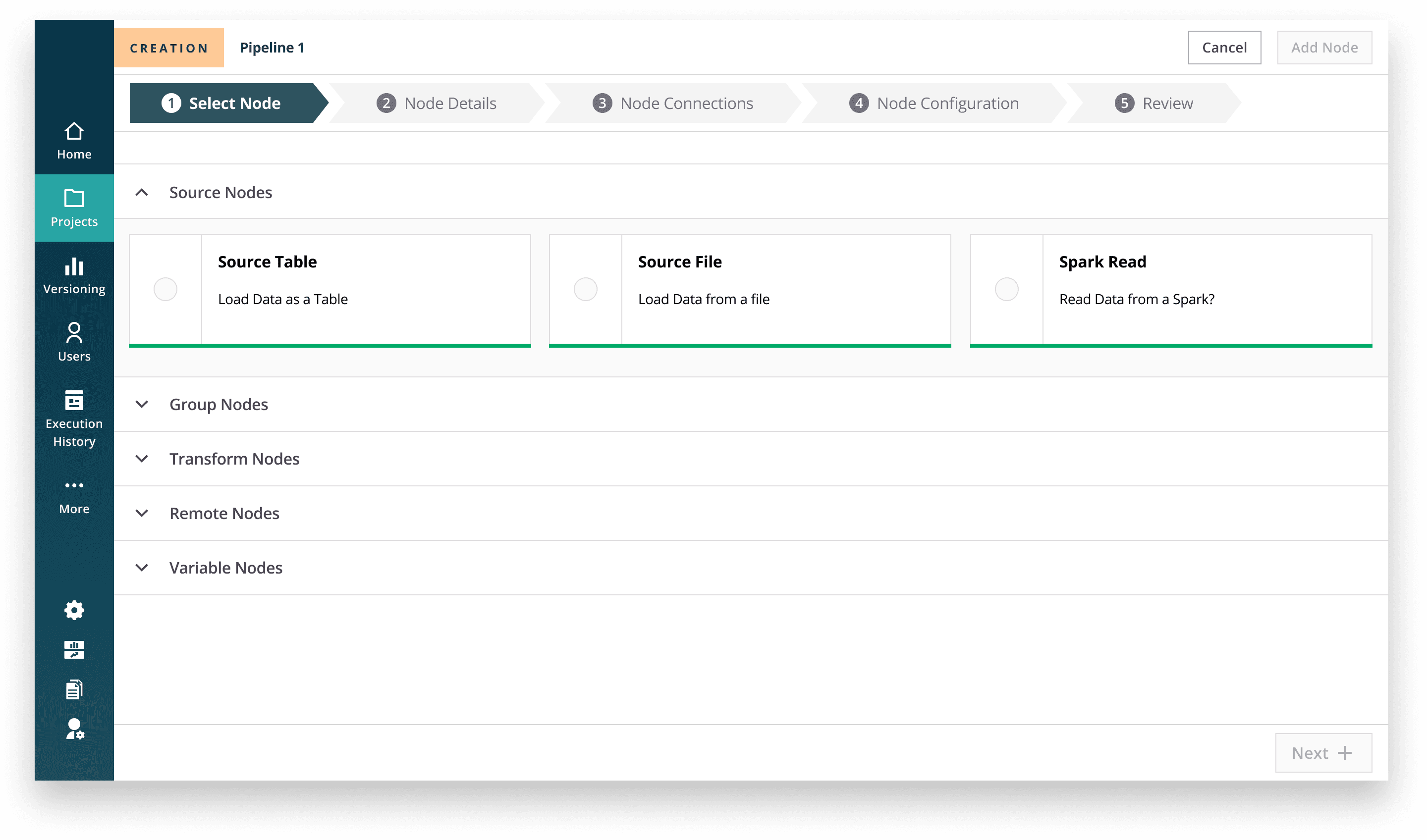 Instead of freeform drag-and-drop, node creation follows a step-by-step workflow: define → configure → connect → review. This structure reduces accidental errors, enforces clarity, and supports safe self-serve usage for external clients.