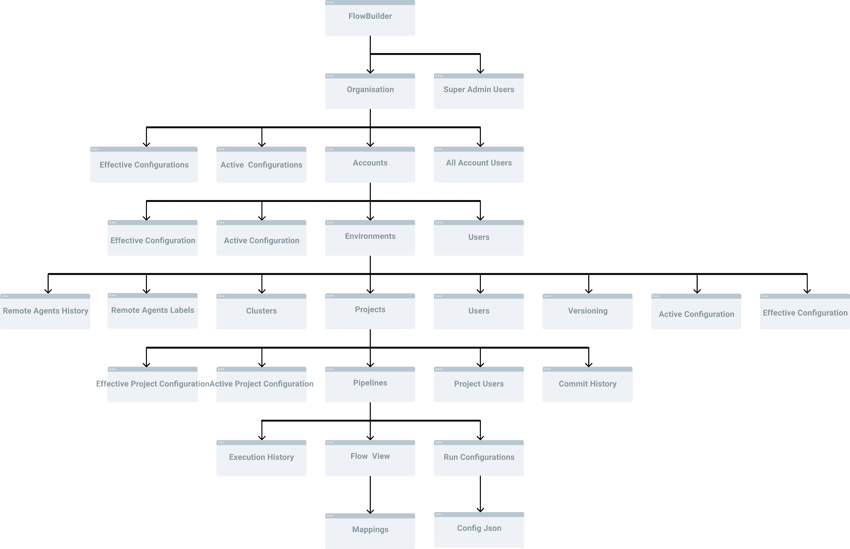 I restructured the IA around a drill-down “spine” from Organization → Pipelines → Node Chains, mapping each layer to specific user roles.